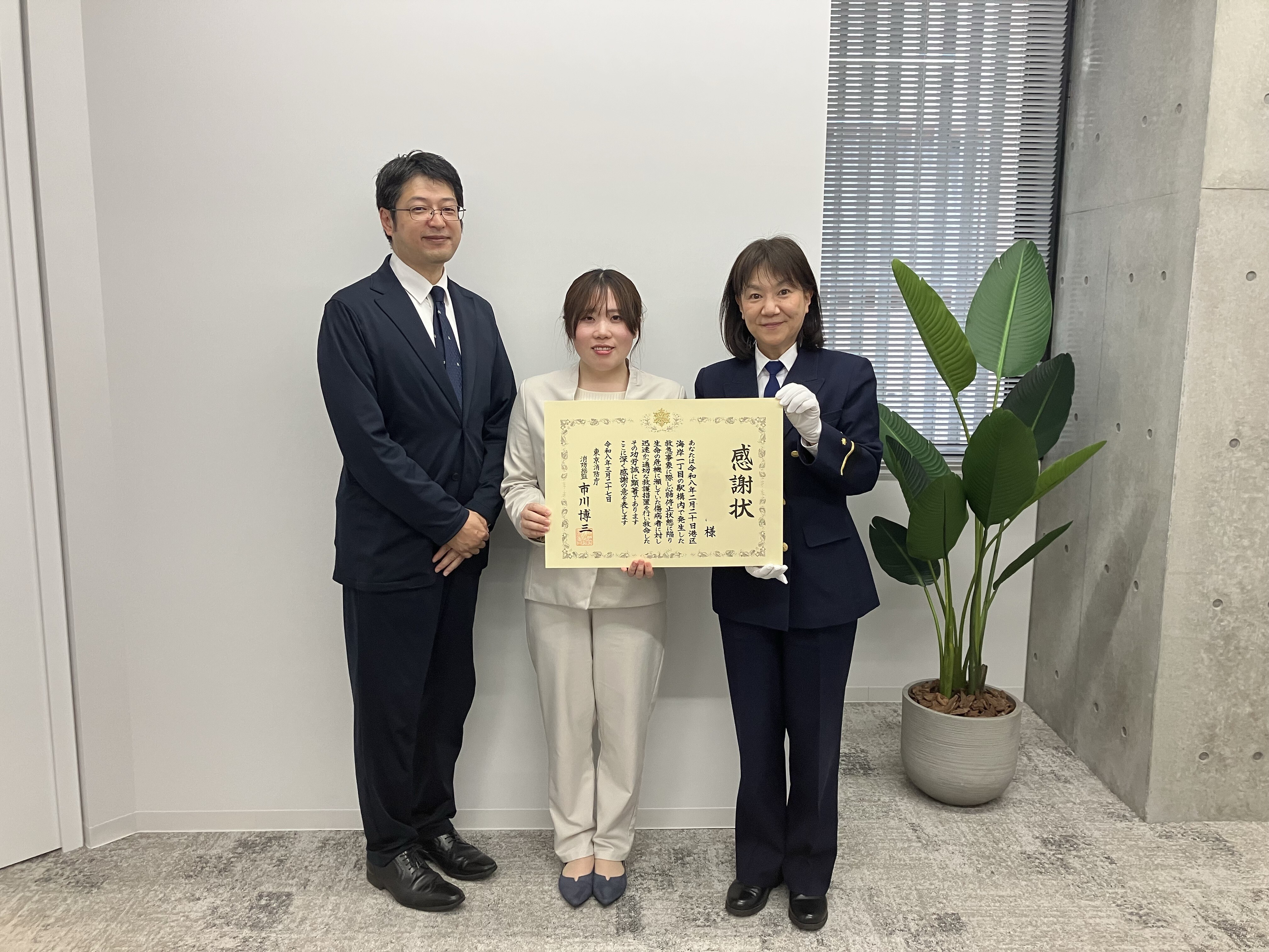 JR車両内での救命活動に携わった当社社員・川村さんが芝消防署より表彰。人命救助につながった連携と想いをお伝えします。