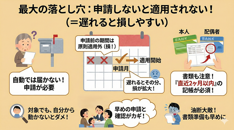 つまり、申請前の期間は原則として適用されにくく、「あとで気づいて損した」が起きやすいポイントです。(例:名古屋市)