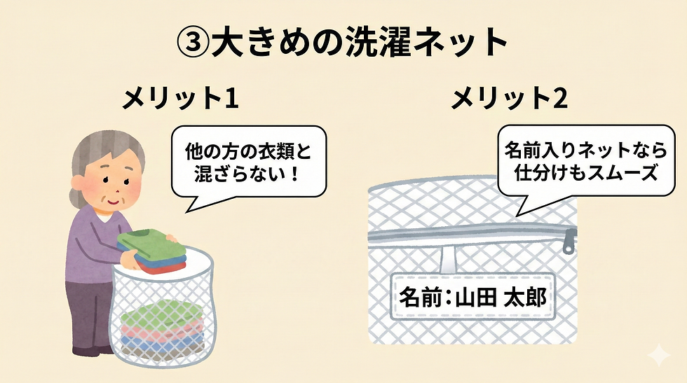 ・洗濯物をまとめて入れることで、他の入居者さんの衣類と混ざりにくくなります