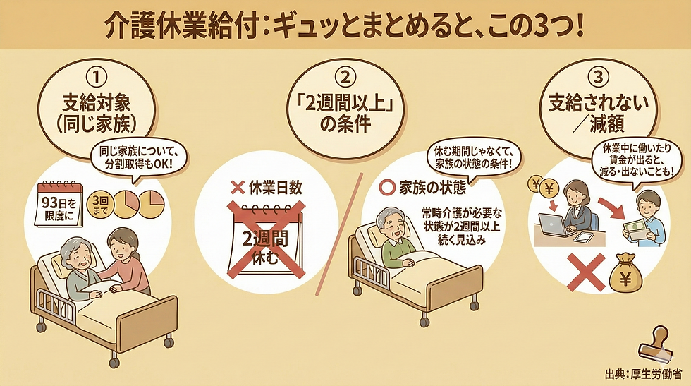 介護休業給付は、雇用保険の被保険者が、要件を満たす介護休業を取ったときに受け取れる給付です。結論だけギュッとまとめると、この3つです。