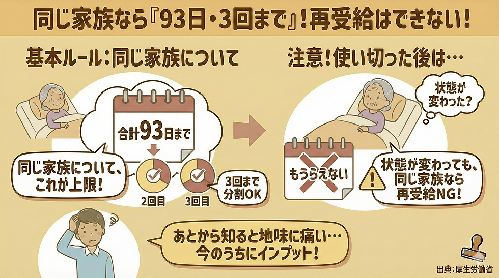 ②同じ家族について通算93日まで・最大3回まで分けて取得しても対象になること、