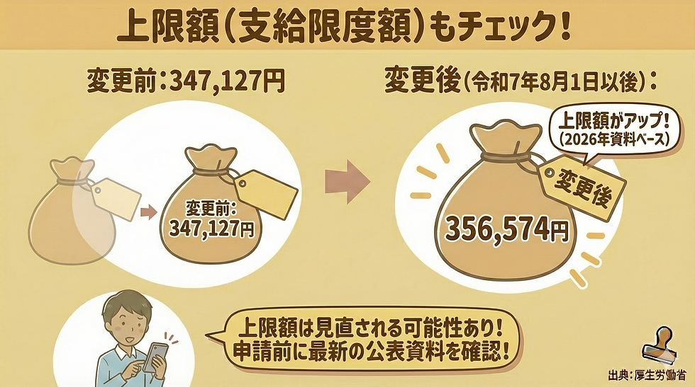 厚労省の公表資料では「令和7年8月1日以後の支給対象期間」から、上限額が 347,127円 → 356,574円 に変更されたことが示されています。