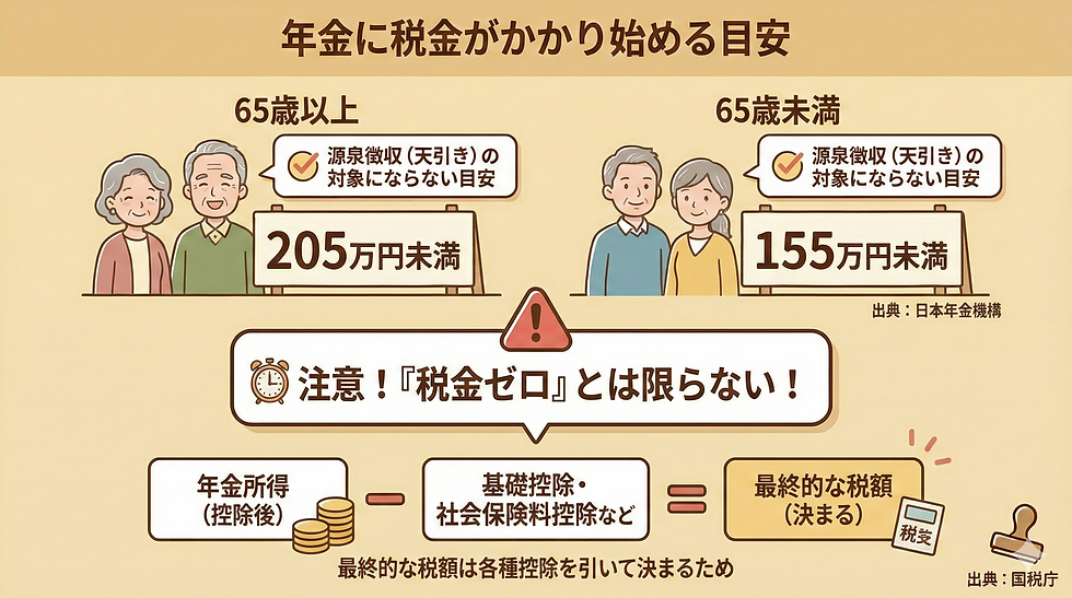 なぜなら、最終的な税額は年金所得(控除後)から、さらに基礎控除や各種控除(社会保険料控除など)を引いて決まるからです。国税庁