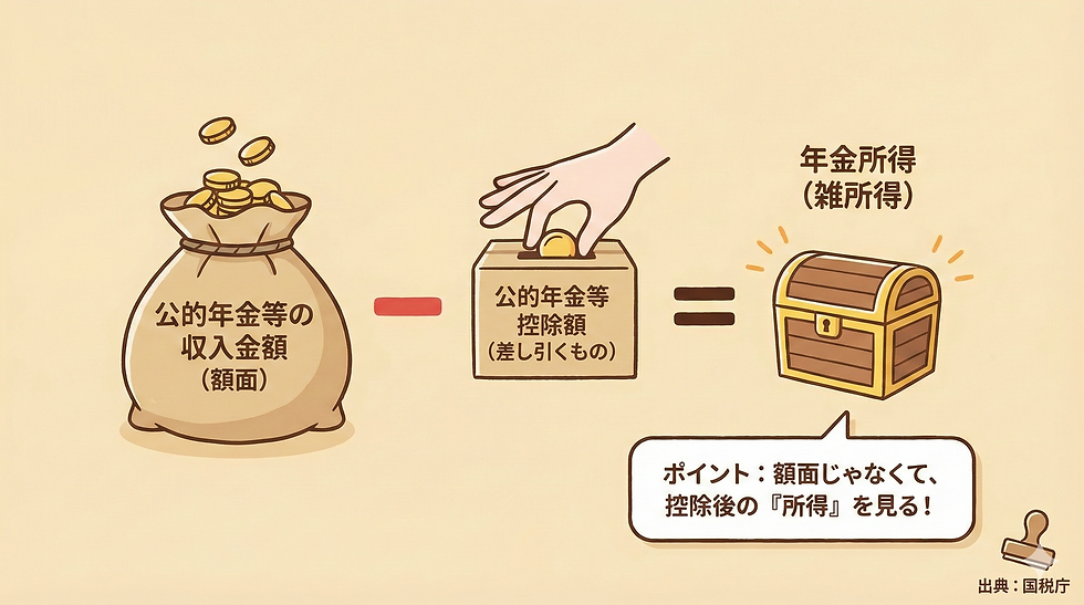 ① 年金所得=年金収入−公的年金等控除で“所得”を見る